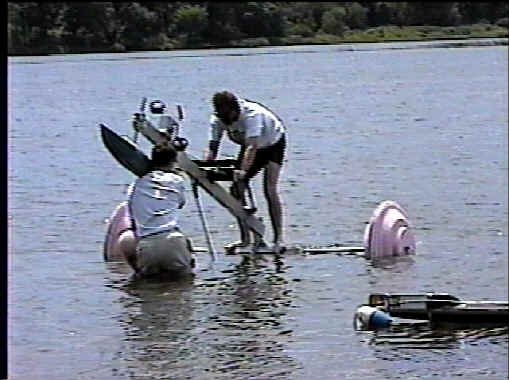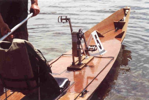 how the backrest is used to steer the hinged hulls - no rudder! |